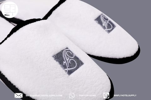 Luxury slippers with personalized embroidery. Our luxury hotel slipper is the ultimate addition to any bedroom. Made of fluffy coral velour with thick sole. The guests will feel luxury when they wear these best custom luxury slippers for hotels.
